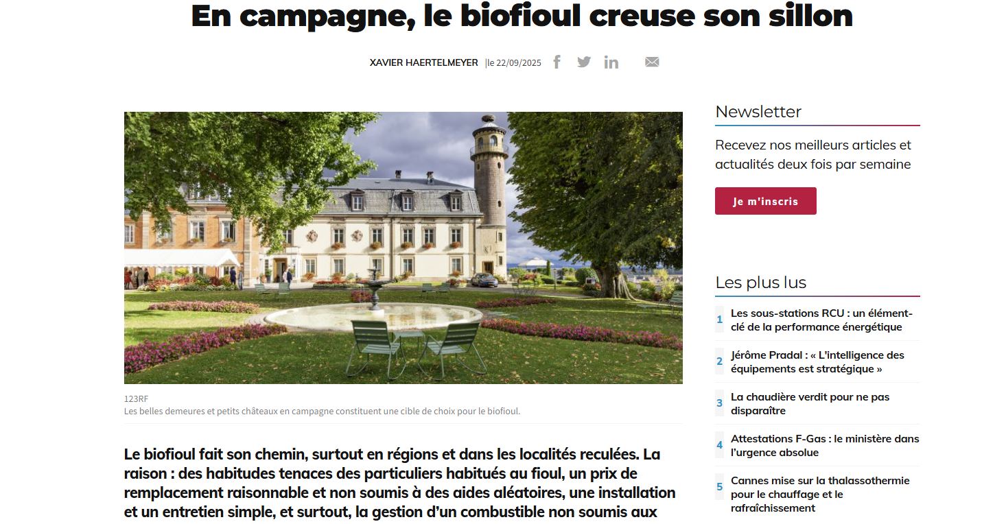 Article de Génie Climatique (septembre 2025) le fabricant français PERGE , spécialisé dans les solutions de chauffage dans les territoires avec les chaudières Bio Fioul déjà compatibles avec les Bio combustibles du futur F55 et F100